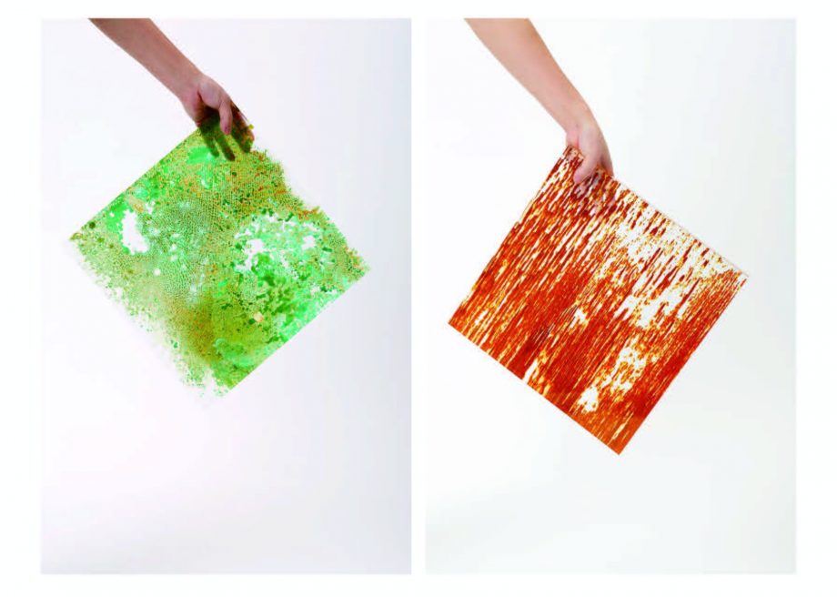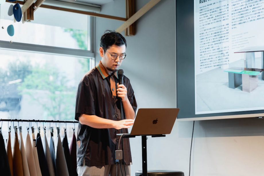 実験的アプローチで新素材を開発し、プロダクトから空間までをデザインする狩野さん。ランドスケープそのものを素材に記憶させたかのような手法で制作されたオリジナル作品の数々に、ユーザーは「触れて確かめたい」と自ずと心を動かされます。工業地帯で放置された鉄屑の錆が「美しい」と目に止まったことからスタートした「Rust Harvest」シリーズでは、無垢の鉄板を海水や雨水に晒したり、土に埋めることで錆を“育て”、錆の粒子をアクリルに転写して“収穫”することで、錆の表情をマテリアルとして“記憶する”ことを可能にしました。