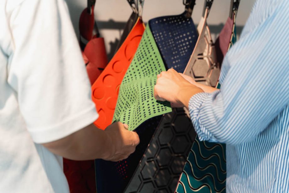 居石:今回、展示していただいたUltrasuede®は、シンプルな無地のものだけでなく、エンボス加工やパンチング加工の生地もあり、工業製品でありながら、改めて、表現の幅広さを感じさせられました。