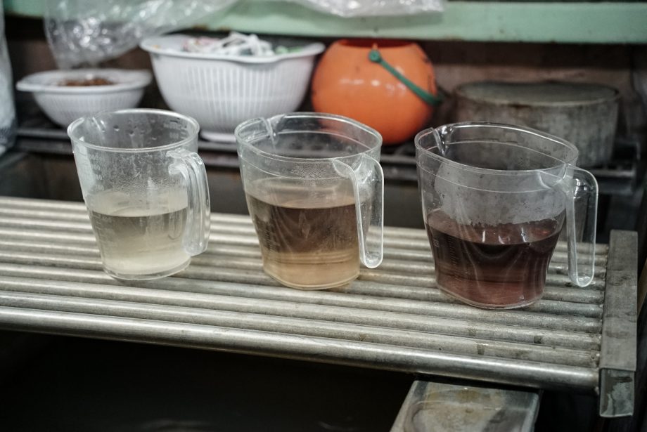 まず最初に、【地入れ】をします。約90度のお湯に服を入れて浸す作業をしました。地入れをすることにより服についた余分な皮脂などの汚れを落とし、繊維に染料が吸収されやすくなるそうです。洗剤を入れていない、ただのお湯に浸けただけで汚れが落ちたことにみんな驚いていました。そして、普段の洗濯の甘さを実感。写真は時間経過ごとに地入れのお湯を取り出したものです。