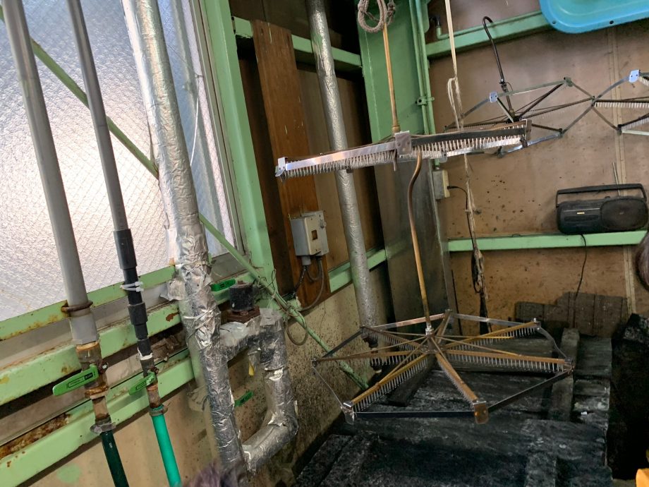 反物(着物の生地)を染めるときに用いられる【かんす】という器具があります。【かんす】に反物を巻き付け、染料に入れて染めているそうです。反物は絹(シルク)で作られているので丁寧に染めていくために、この【かんす】が使われています。