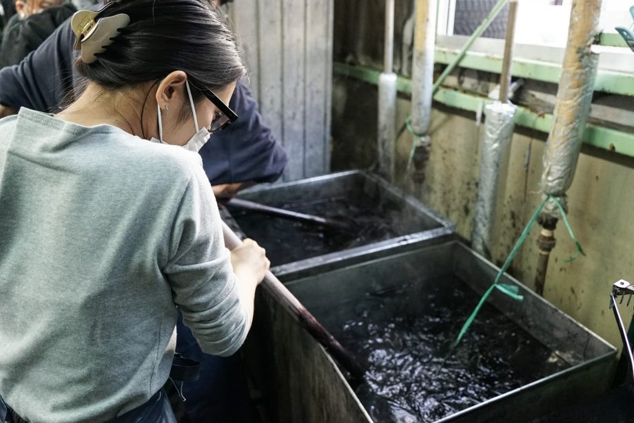 「普段はこれを二つ同時並行で行っているんだよ。」と中村さん。これを聞いたクルーは「職人さんは簡単そうにやっていたのに…」と、職人さんを尊敬していました。この後は、お湯に入れて攪拌、染料に入れて攪拌、という工程を10回程度、繰り返し行いました。お湯に入れて攪拌するのは、洗濯をしたときに他の衣類への色移りを防ぐため。染め始めから染め終わりまでの所要時間は約5時間。長時間の作業をクルーで交代しながら進めました。