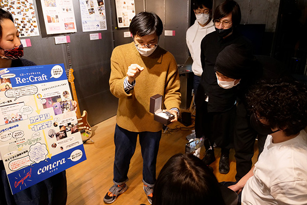そこでプロジェクト名を”concra”(conは”一緒に”、craはクラフトの意。congratsという意味も重ね、「一緒に作って祝福しよう」という意図)に変更。それまで私物をアップサイクルしたい人を広く募っていたアプローチを少し変え、自分たちがまず作ってみることにしたそうです。岩田さんは、宇治の歴史ある組紐の製造・卸・販売会社「昇苑くみひも」さんとともに高校時代に買った思い出のバンドTシャツをギターストラップにアップサイクル。同じくメンバーの金属工芸作家の須藤さんは、お父様から譲り受けた時計を甲冑に施す技術などを駆使して作り替えたとのこと。想像を遥かに超えるものができてきて、自分たちがやりたいことの方向性には確信を感じている様子です。今はアップサイクルするためのエンジンとなる個々の想いをどう引き出すかという議論をしているそうです。