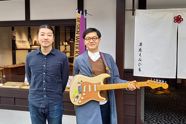 高校時代の岩田青年が買って着古したバンドTシャツも職人の力で一生使えるギターストラップに生まれ変わりました。完成したストラップを装着して昇苑くみひもの八田さんと。岩田さんうれしそう。