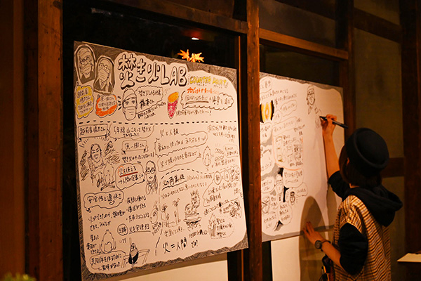 焚き火LABのイベントにて初グラフィックレコーディング。この時の越前屋俵太さんとの 出会いが、その後の彼女の新しいスタイルと仕事を作ることになろうとは、この時誰も知る由はなかった。