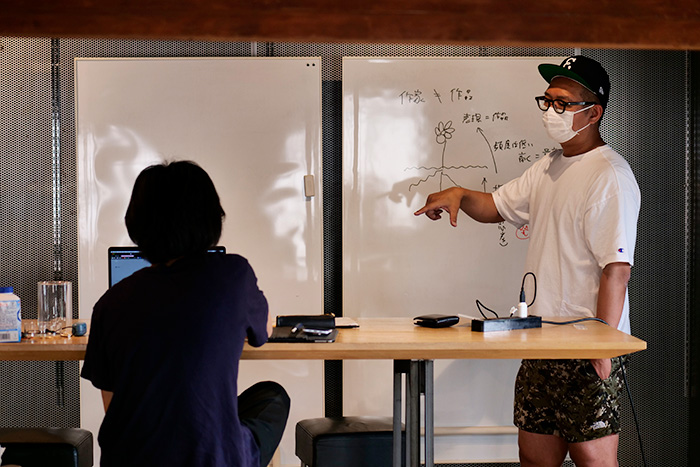左手前は同期の平井さん。科学視点でアート作品を作るという点で共通したふたりで壁打ちしているシーンもありました。