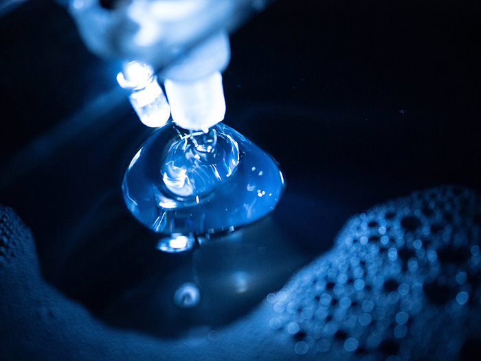 そこでできたのが、「Light Face」という、チンダル現象を利用した液体の形に新しい捉え方をするための装置。水滴を落としてそれをレンズとして光を当てて、ランダムに現れる光の筋を作っています。この作品は9月に東京のスパイラルで開催される「SICF」に展示したあと、11月に大阪の展示するとのことで、引き続きブラッシュアップしていくとのこと。