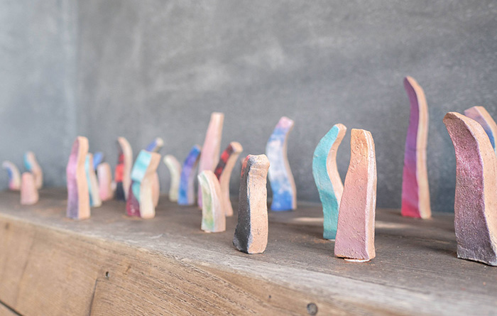音楽ならそれ自体に意味を考えたりしないのに、なぜか造形物には人間は意味を求めたがる。縄文人はもしかしたら造形物も感覚的に作っていたのでは?現代人は少し頭で考えすぎなんじゃないか?と、頭のない土偶をみた時に思い、「頭なし土偶」という作品として展示した。(頭は焼成時に吹っ飛んだ)