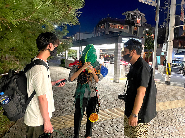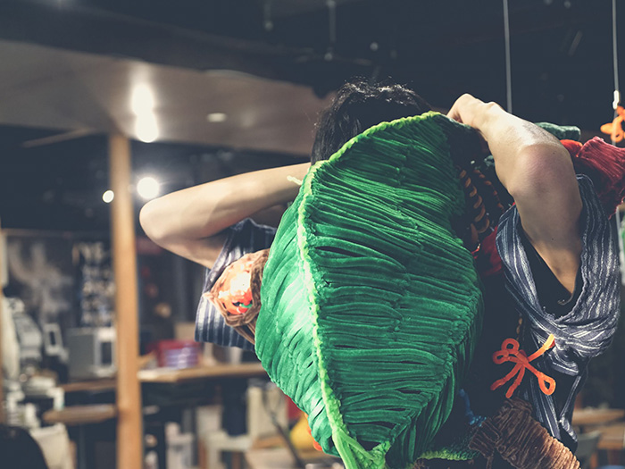 メインワークとなる毛殻の制作は、主に最後の1.5ヶ月で作ったとのみつるさん(前半は企画&資金集めなどをしていたのだそう)。できた毛殻は上半身を覆うもので、思っていた以上に居心地がよく、動きやすかったようです。試行錯誤を経て、「毛殻やぶり」のパフォーマンスは、毛殻を纏って京都市内を歩き回り、FabCafeに戻ってきて毛殻を破るという形でを4回に渡って実施しました。写真撮っていいですか?と声かけてくれたり、その場でモールアート作ったりと、新たなコミュニケーションの場ができたことは思っていたより気持ちよかったのだそう。(すごくシャイな方だと思っていたけど、そんなことなかったんですね!)