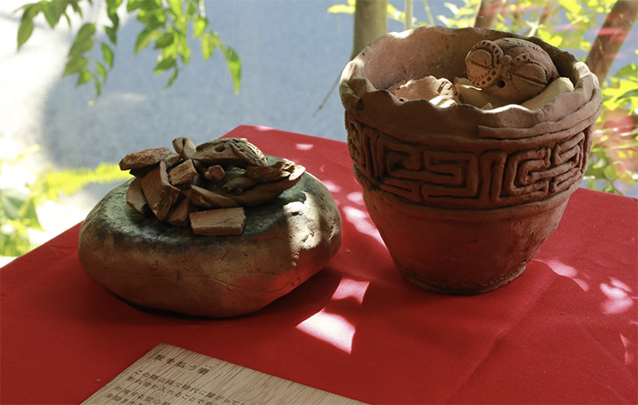 縄文時代は所有と言う感覚がなかったのだそう。焼成時に割れた破片(割れ物)と、我物を掛けてつくった作品。