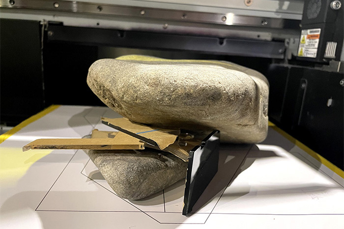 形が歪な石にプリントする中で、おそらくどのFabCafeスタッフよりもUVプリンターを使い倒し、特殊な技を上達させていったノガミさん。