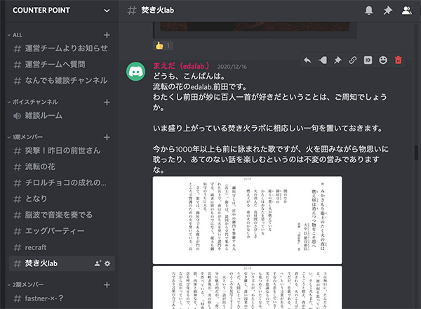 突然、Discordで「焚き火に合う一句」を選んで投稿した「流転の花」前田さん。