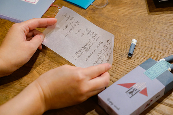 山口さんの作品は、どれも封が閉じられている。そして、さまざまな紙が使われていて、とにかく美しい。写真はタバコを模して作られた「閑」。タバコのような小さな筒を広げると、ひとつひとつ異なる詩が書かれている。ロマンしかない。