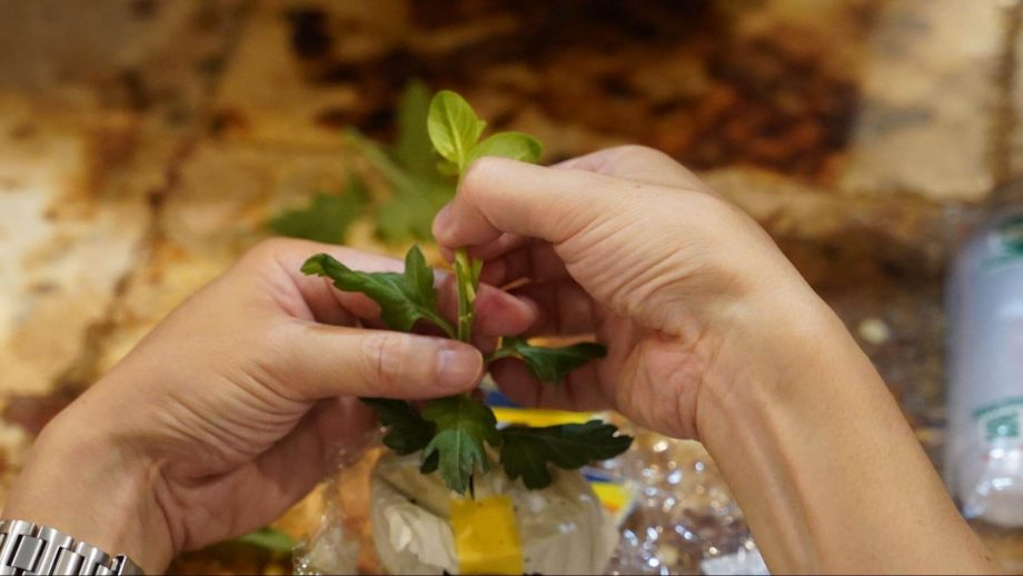接木の基本的な作業は基本的に非常にシンプルです。カミソリで一方の植物を切り取り、縦に割いたもう一方の植物に挟み込み固定するだけです。出来上がったら、乾燥を防ぐために接いだ部分にビニール袋を被せます。しかしこれだけのことが案外難しく、参加者一同集中して取り組んでいました。運営メンバーも挑戦しましたが、しばし時間が経つのを忘れて黙々と作業に集中してしまいました。