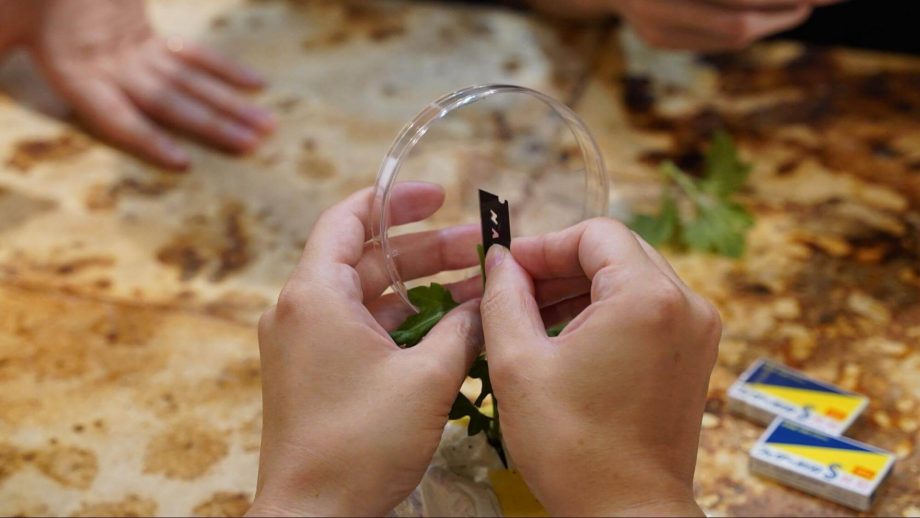 2日目はいよいよ実践です。前日に用意した植物を、野田口教授にご用意いただいたタバコと運営で用意したペチュニア(タバコの仲間)を使って接いでいきます。まずは野田口教授に手解きとデモンストレーションを示していただきましたが、迷いないカミソリ捌きに歓声が漏れ出ました。