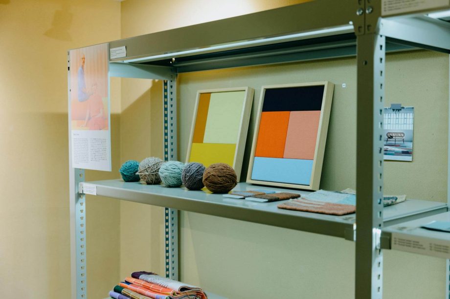 FabCafe Fujiの奥の部屋において、Raw Colorのクリエイティブプロセスを紹介する展示(右側)と、富士吉田の機屋をリサーチする中で見つけた、それぞれが持つ独自のツールやインスピレーションになっているものの展示(左側)(© Fuji Textile Week・photo by 吉田周平)