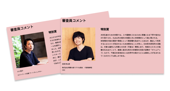 さまざまなバックグラウンドを持つ審査員が、各々の視点で賞を授与します。 あるプロジェクトが別のプロジェクトよりも優れているかどうかを判断することを目的としたものではなく、循環型経済を目指す社会・個人に新たな気づきや視座を与える、クリエイティブで独自性・将来性のあるプロジェクトを、発見・支援しています。