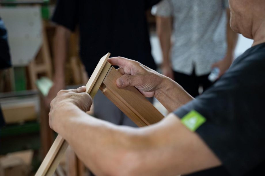 素材を手に取り、観察しながら、素材の選定やその組み合わせについて話し合い、プロトタイプとしての建具の製作を行いました。また、素材のひとつである広葉樹について知るため、製材所や製作パートナーである職人の工房へ訪問し、木が加工できる材になるまでの過程や、製品化に必要なディデールへの理解を深めました。この過程を通して、人と木との関係を見つめ直し、その関係性に潜む可能性を探っていきました。