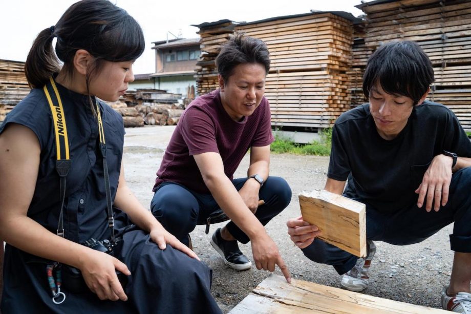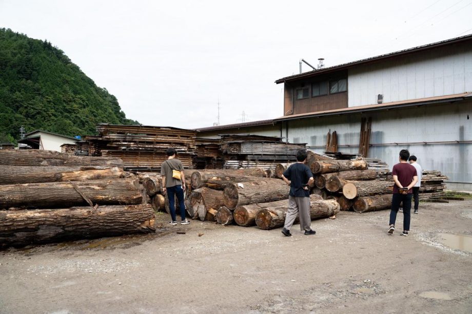 Day2の午前中には、飛騨の木の知見を広めるためのヒダクマツアーを実施。ヒダクマスタッフの引率で西野製材所へ訪問しました。ここは県内でも有数の広葉樹に特化した製材所です。迎えてくれたのはオーナーの西野さん。原木を挽き、乾燥し、加工できる材に仕上がるまでに通常1年以上はかかるという製材の工程について説明してくださいました。