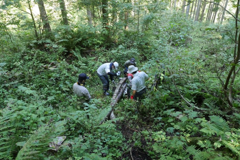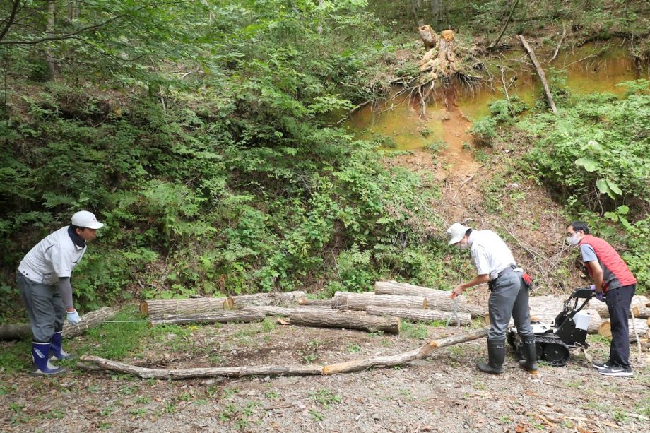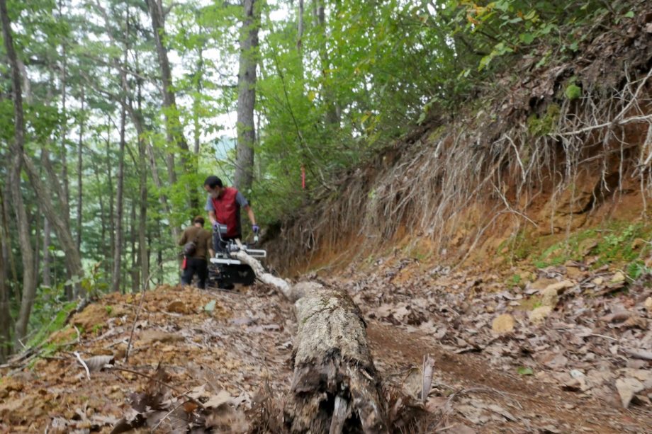 大きな道をつけなくても、人が歩けるだけの道をつけることができれば、少しずつでも木を運び出すことができます。