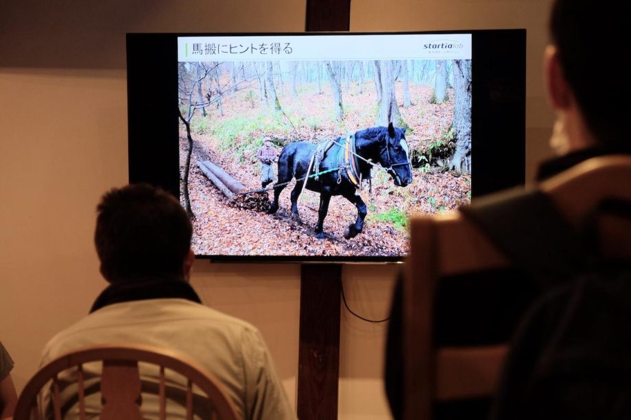 そして、山猫のこと。林業にとって木材の搬出作業は大きな課題です。当初はドローンでの搬出を考えていたそうですが、航空法の関連で断念し、岩手に残る馬搬に着目。中・大型除雪機生産高日本一のメーカーである和同産業さんにお声がけされました。