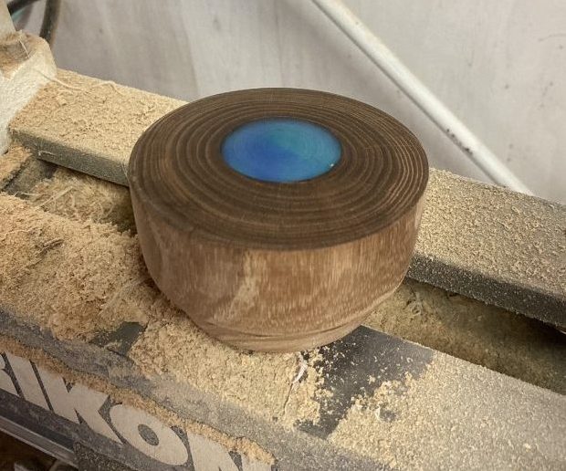 初めて木工旋盤を使って作品作りをしてみましたが楽しく作品づくりができました。槐の木、重さと木肌が高級感があるいい木材で勧めてもらって良かったです。レジンの利用も初めてでインスピレーションで作った作品となりました。今後は飛騨の広葉樹を使って、木工の楽しさを伝えていきたいです。