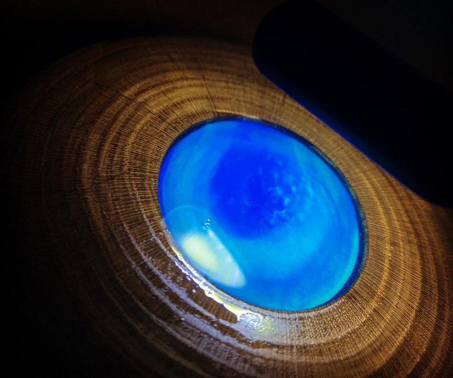木を削る中、前々から試したかった木とレジンの組み合わせをこの作品で実践することに。ブルーとエメラルドグリーンの発色を際立だせるために、中には白い厚紙が入っています。初めての加工のため、刃物の切れ方と切削方向に気を付けながら安全第一で製作しました。