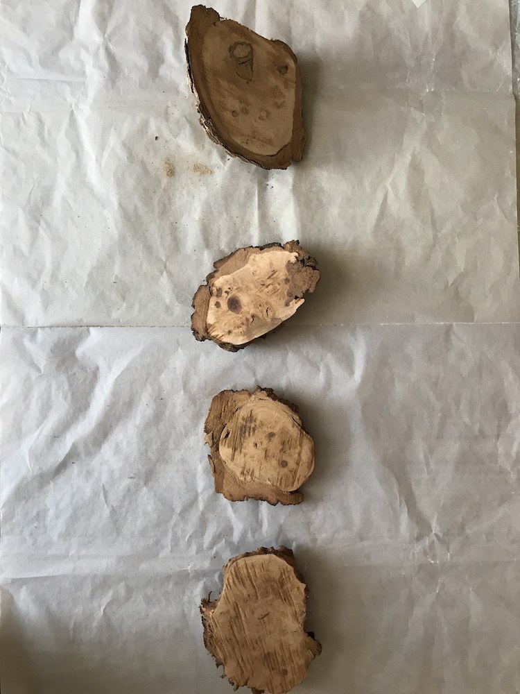 乾燥が進むにつれホオノキのコブの緑色が抜けていったり、分解されていったり、コブを置いているだけで部屋が木の匂いに満たされて、生きている素材だということをいつも思っていました。そのことを大切にしながら、コブにふさわしい作業をしたいと思いましたが、今回は少し作りすぎてしまったと感じています。残っているコブで、今度は子どもが遊ぶように制作したいと思っています。