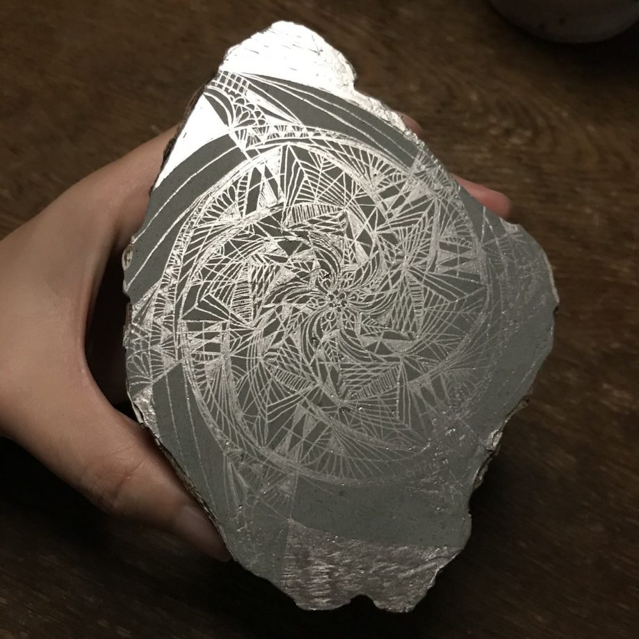 岡林さんが目指したのは、手のひらに収まるコブを使った工芸品のような作品でした。即興の勢いがありつつも精密さを感じる図案が、コブのキャンバスに描かれています。何も手を加えていないコブの荒々しさと図案の対比が印象的。