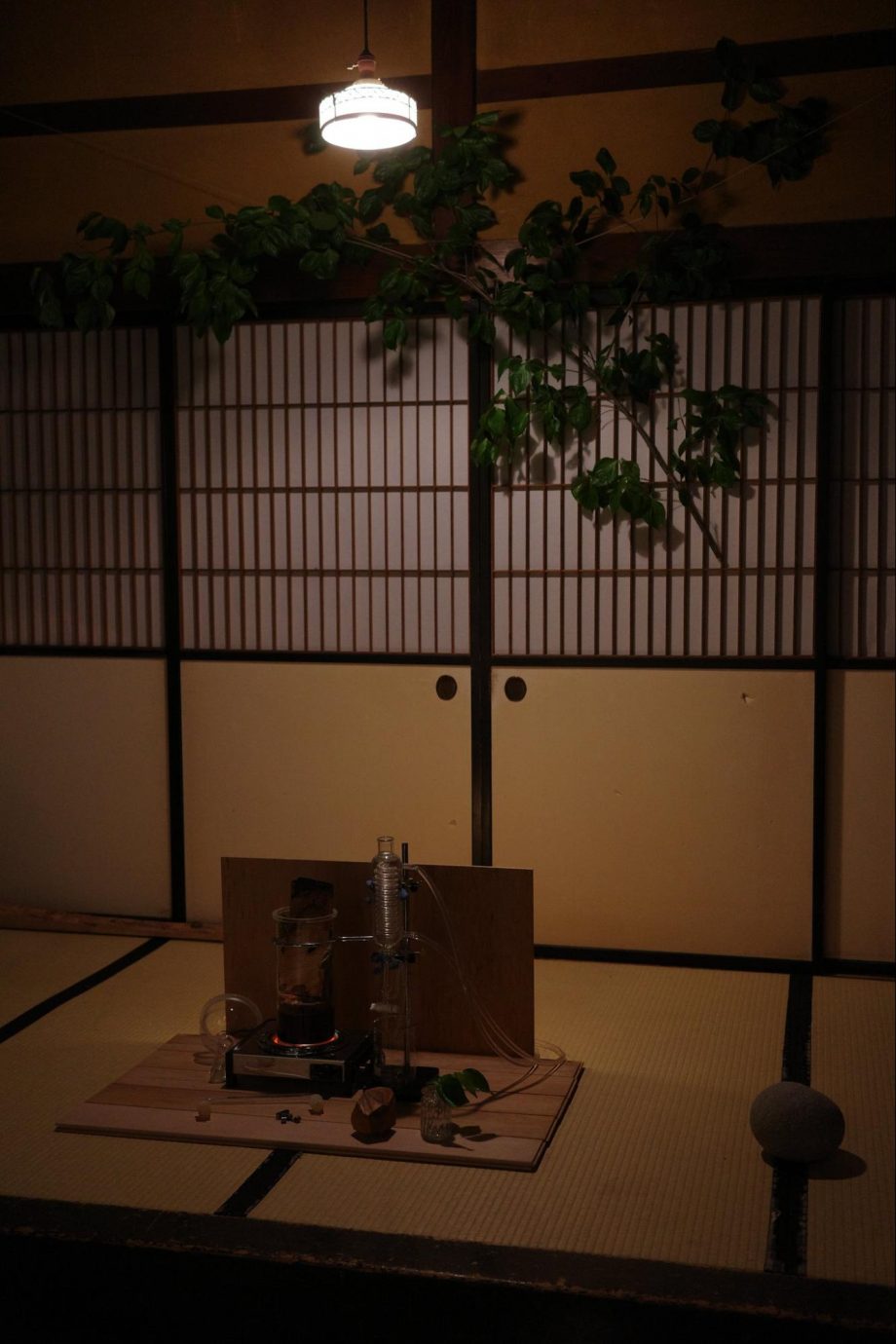 映画上映には、顔馴染みの方から、FabCafe Hidaに初めて来てくれた方までたくさんの方がお越しくださり、昼とはまた違った雰囲気で上映前から賑やかな様子でした。noixさんが玄関に設置した蒸留ブースも映画のストーリーに合う素敵な演出で、ケヤキの渋く湿りけのあるちょっとスパイシーな香りがより、ムードを高めました。