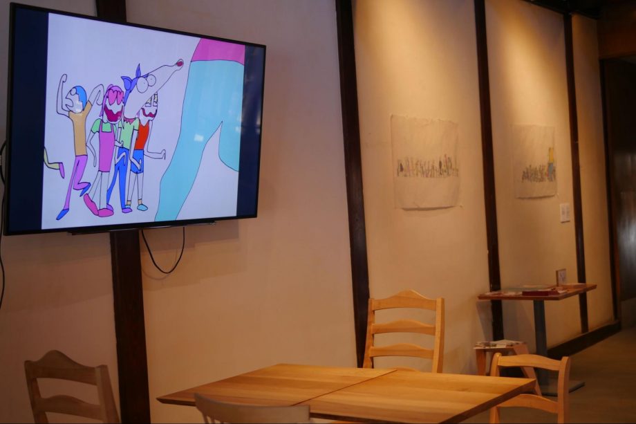 店内にはJoさんの描くポップな世界が広がり、FabCafe HidaスタッフもJoさんの描くキャラクター達と一緒に、毎日楽しくコーヒーをドリップしたり、Fabマシンを使ってものづくりをしています。