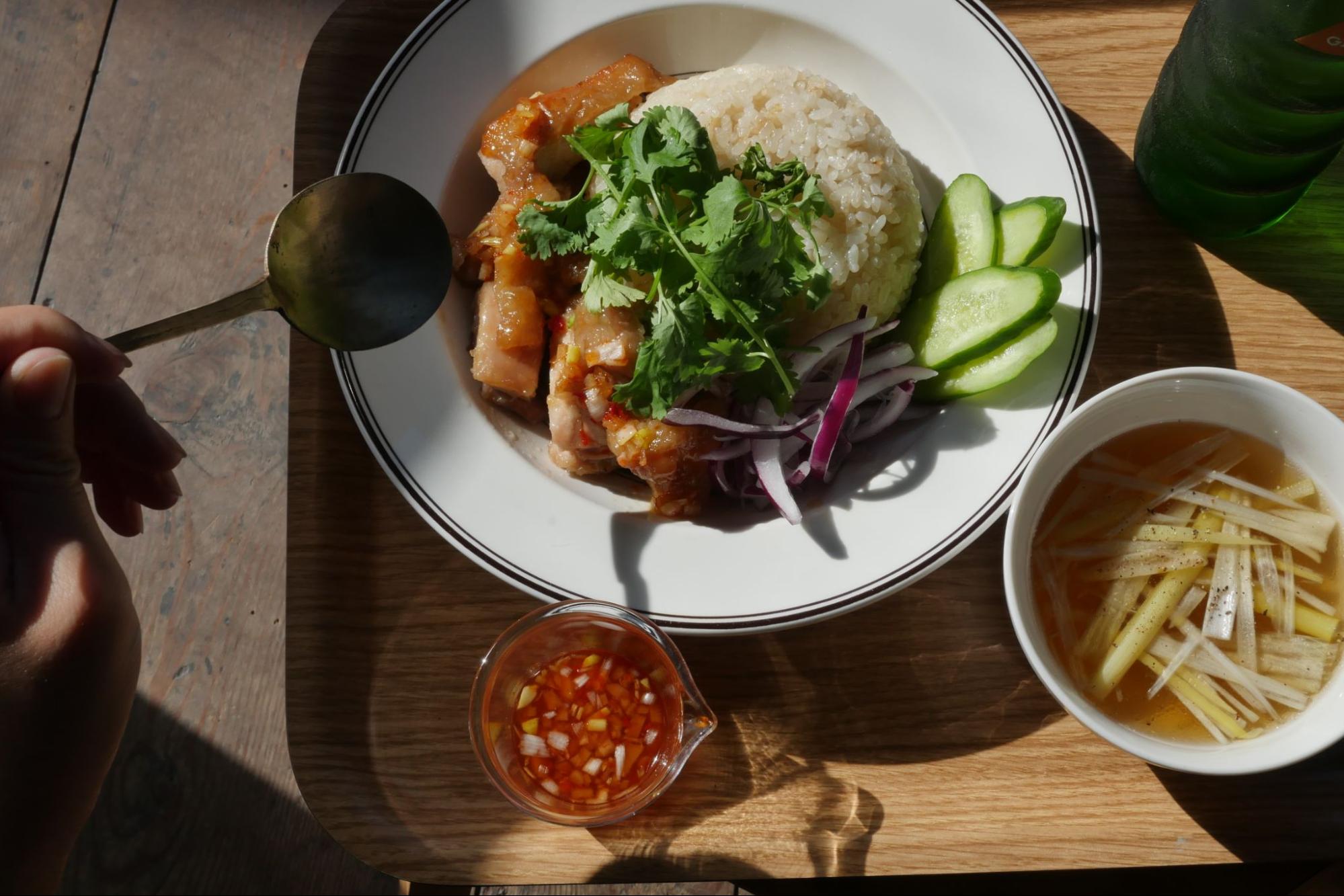メイン料理の茹で鶏を使用した照り焼きチキンは、ナンプラーや香草が香る異国を感じられる一品。その鶏のガラスープを使用した炊き込みご飯と一緒にお召し上がりください。トッピングの紫玉ねぎやきゅうり、パクチーとの相性は抜群です。セットで付いてくる、ねぎのスープは、鶏のガラスープであっさり仕上げました。