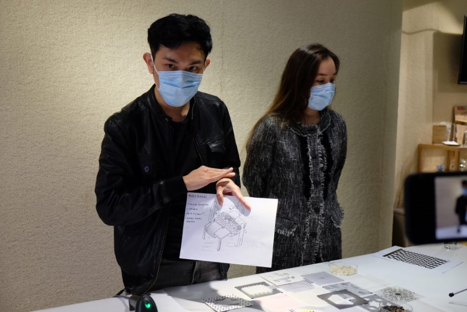 グループ2は、香港の伝統的なスタイルである「赤白青の袋」のような生地や素材を集め、さまざまな形やパターンを組み合わせてコラージュしました。和田さんは、このプロトタイプにはデザインや音の可能性がたくさん詰まっていて、とても”ハードコアなパフォーマンス”だとコメント。