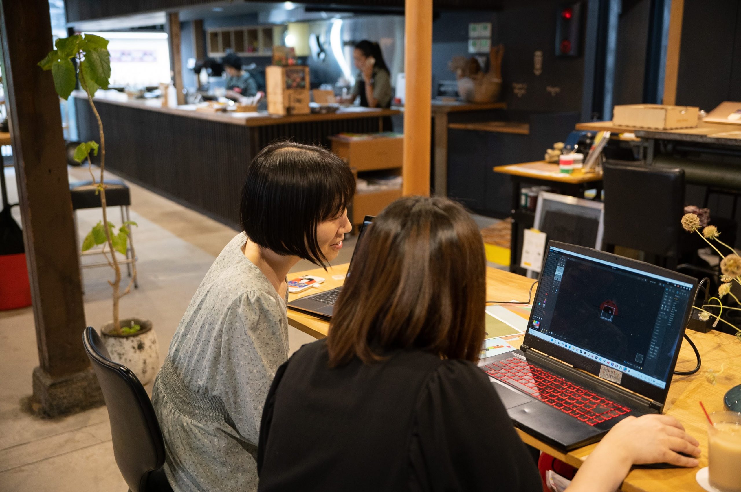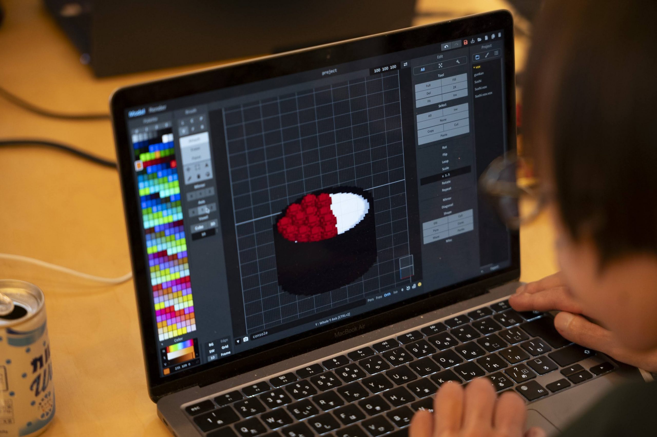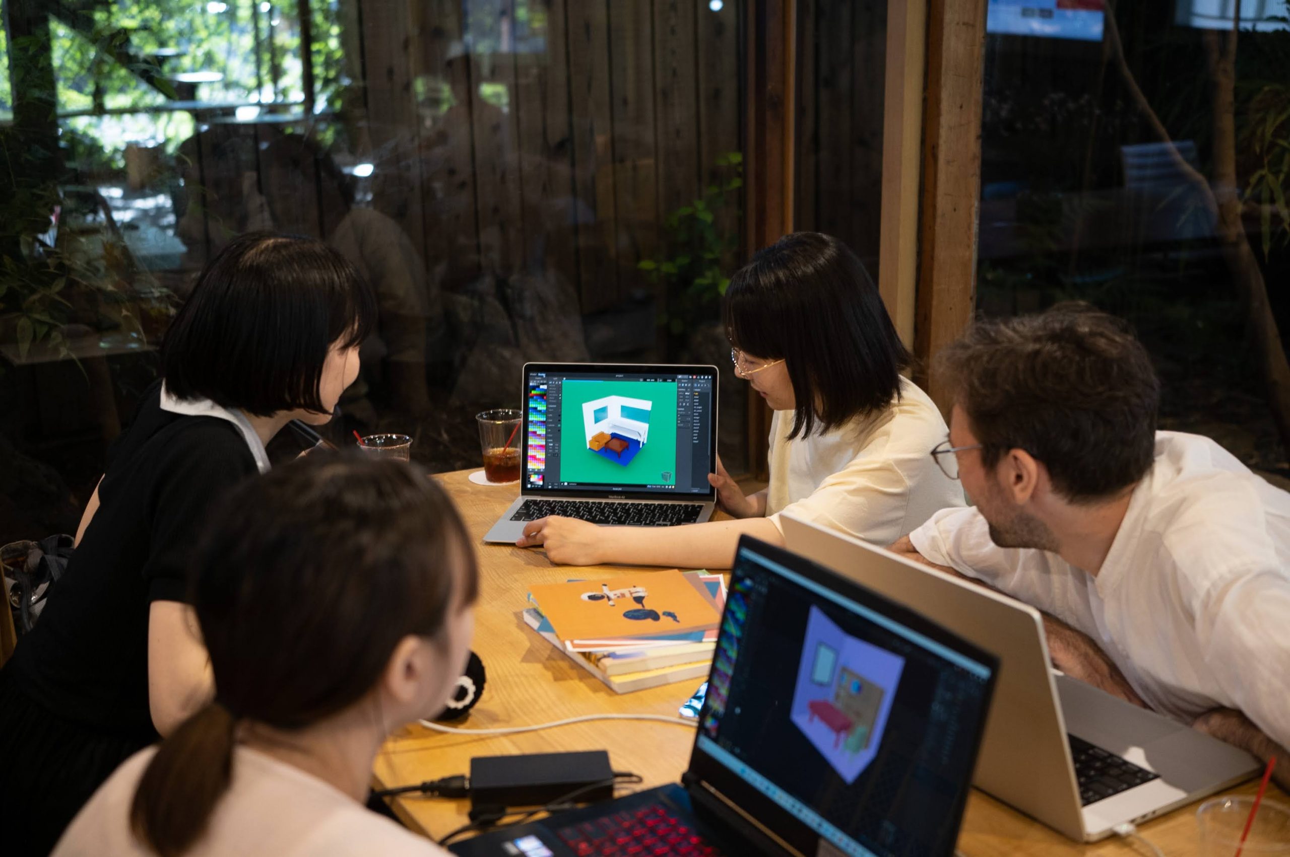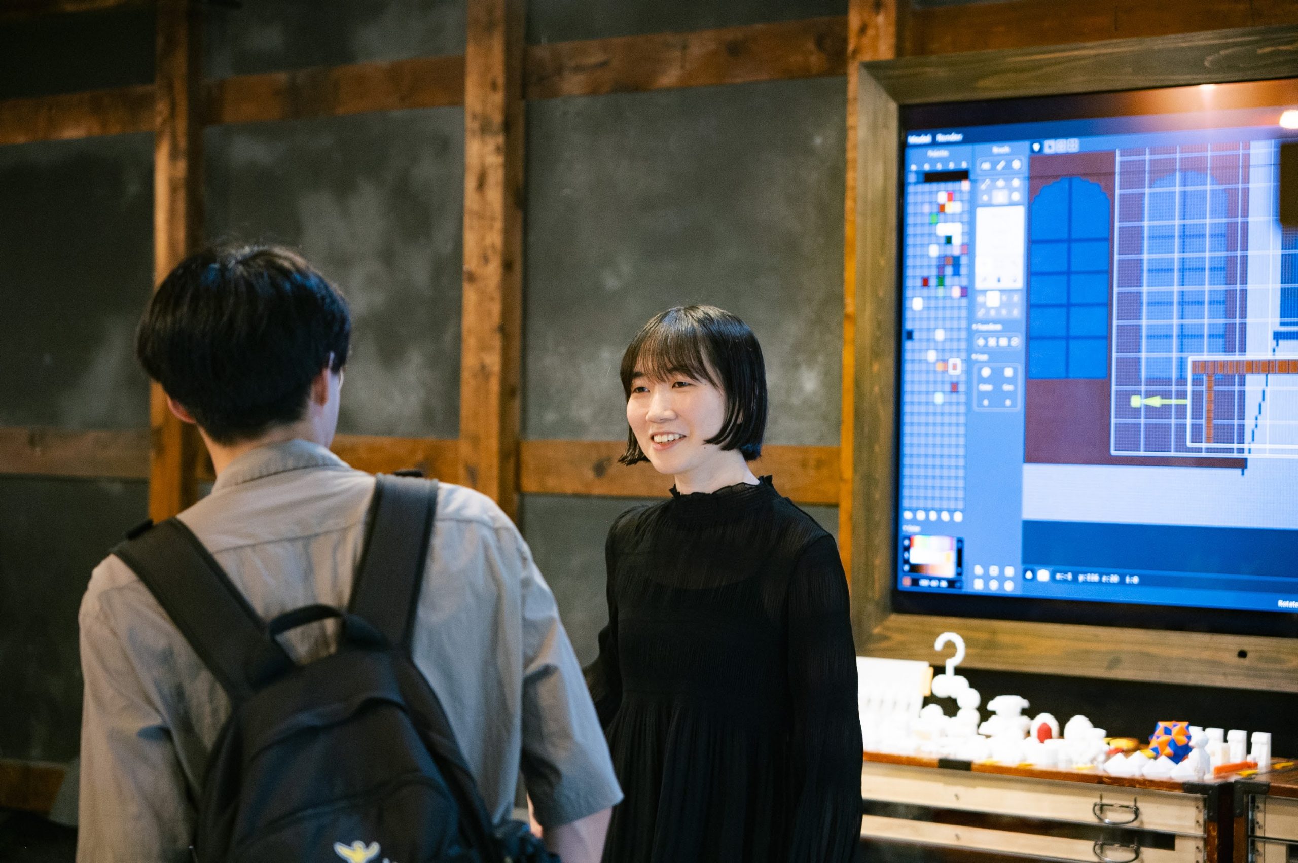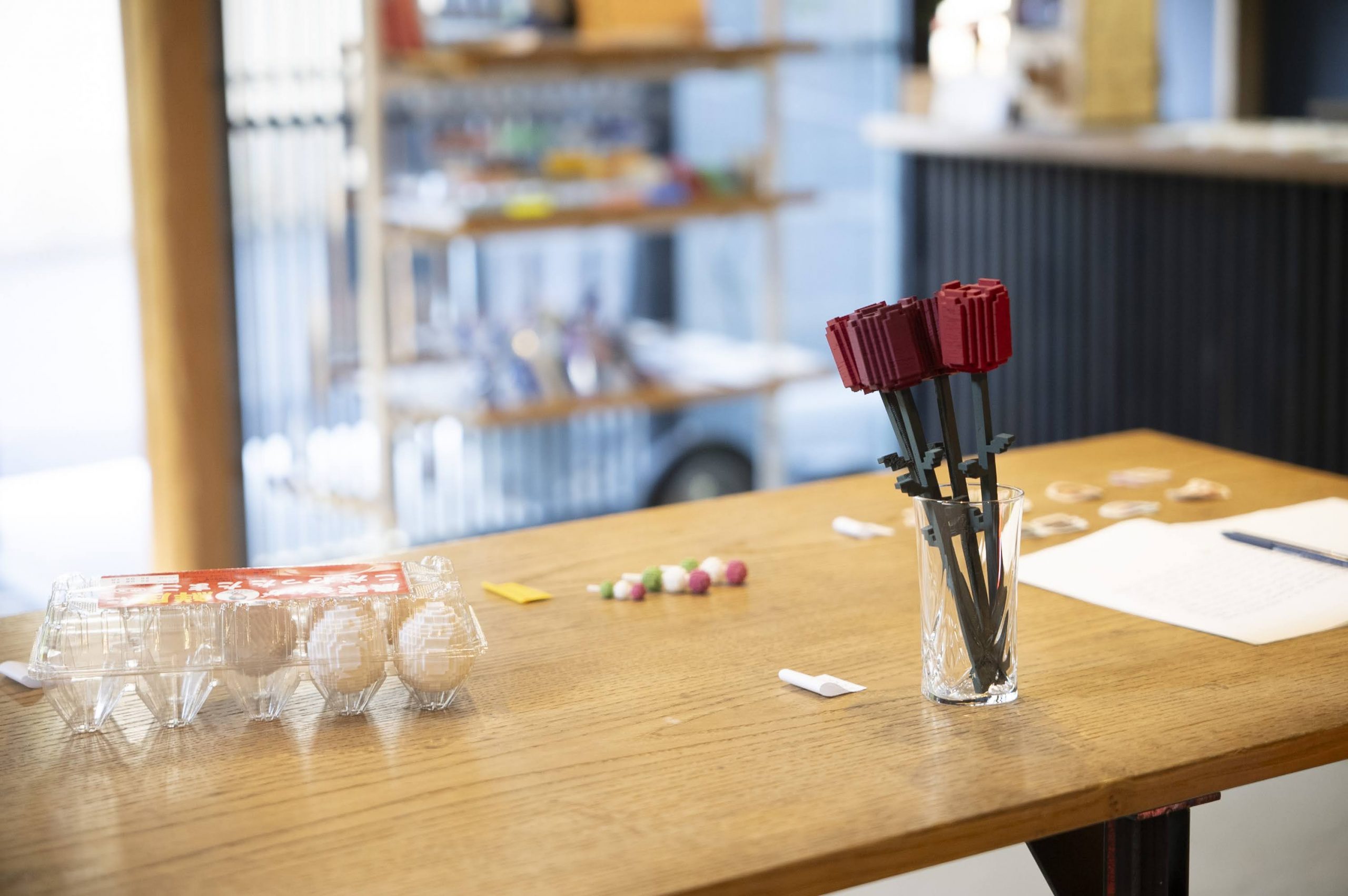 個人制作と並行し、期間中、6月の毎週火曜日に「ピクセルモデリングクラブ 『かくかくしかじか』」を開催。参加者は学生から社会人まで幅広く、各回2〜3名が参加しました。「教える/教わる」という一方向的な関係性を意図的に避け、同じ机を囲み、時に雑談を通しながらナレッジを共有。スキルを伝達することと同じくらい、参加者からも何かを受け取ることを重視していたと語ります。ワークショップ終了後には、自ら教本を購入し自発的に制作に取り組む参加者や、制作したモデルをお店まで見せに来てくださる参加者の方の姿も見られました。