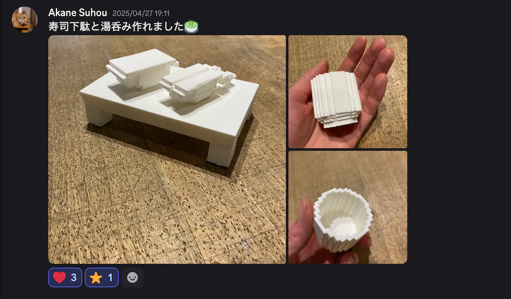 活動中は成功や失敗の区別を設けず、工程の中で発生する偶然やエラーを積極的に歓待しながらアイデアを繰り返し形にする姿勢が一貫して見られました。このような制作態度は、デジタル工作ツールを専門的スキルではなく、「創造の手触りを取り戻すための媒介」として位置づけるもの。活動前には、自身にとって「難しい機械」であったという3Dプリンターも、結果として「もう一度触ってみたくなるツール」へと変化したと語ります。