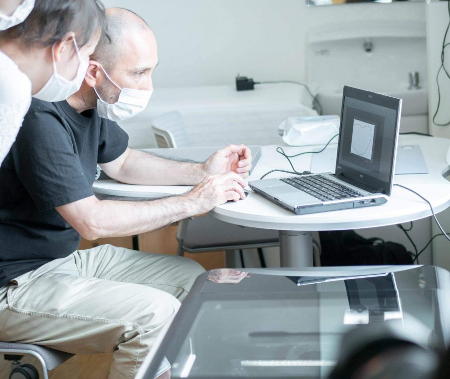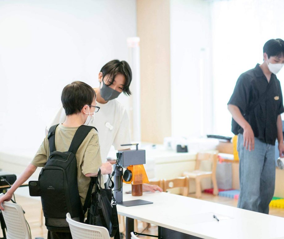 この日、5名の大学生たちがワークショップの運営に参加してくれていた。それぞれ京都産業大学、京都芸術大学でデジタル工作機器の扱い方を学んできた彼らは、自身の制作手法や研究の対象として機材や機材を取り巻く人との関係性と向き合ってきた経験をもつ。
