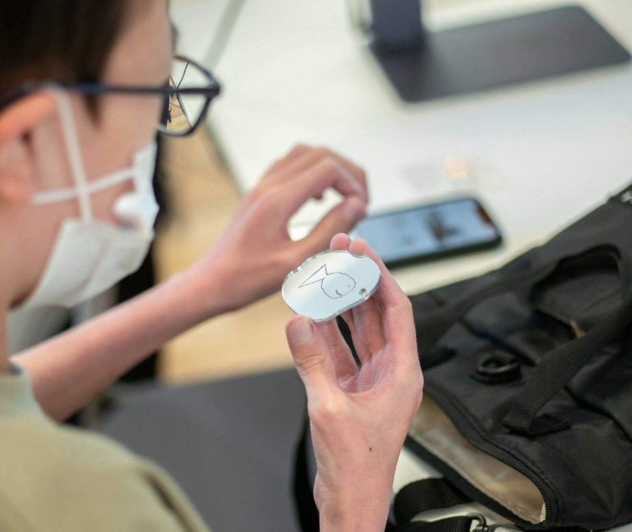 また、今回はレーザー彫刻が体験できる実演コーナーも用意。あらかじめ小さく切り抜いた水たまりの裏に、自分だけの図案を彫刻加工として施すことができる。京都産業大学情報理工学部の学生であり、合同会社TSUKUMを主宰する徳山さんが中心となり、持ち運び可能なレーザーカッターを操作する。スマホで撮影した図案を専用アプリでデータ化し転送、1分足らずでミラーアクリルが図面の通りに切削されることで、鏡面側から見ると加工部のみが透けて見える。その小さな躯体から彫刻加工が施される様子を皆、興味津々で見つめていた。鏡の外形に沿って水紋を描くアイデアや、将棋好きな子は水たまりの形の「飛車」を象るなど、そこには自由な表現がいくつも生まれていた。