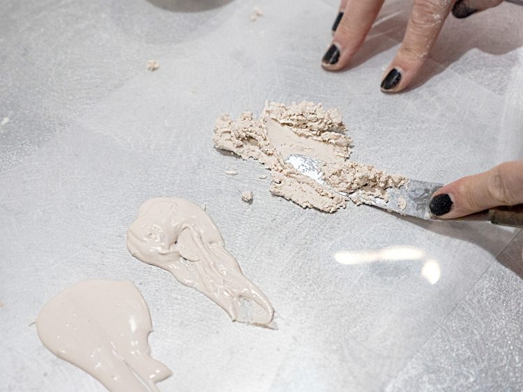 松本 ジェスモナイトにはいくつか種類があるのですが、基本的な使い方は「ベース」と「リキッド」という粉と液体を一定比率で混ぜて液体にして、それが一定時間経つと固まります。固まる前に、型に流し込むか、塗るか、ガンで吹くかなど様々に使えます。