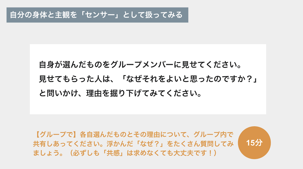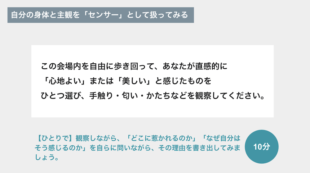 ワークショップでは、各参加者が、自身の身体を「センサー」として扱い、主観を入口に自らの問いと仮説を立ち上げることにチャレンジしました。