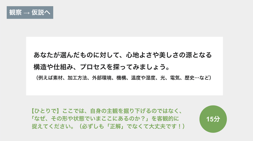 後半は、理屈ではなく直感的に「なんとなくよい」と感じるものやかたちを探し、それを観察し、他者への共有を通じて「なぜ、自分はそう感じるのか?」「その “よさ” は、なぜ生まれるのか?」についての仮説を掘り下げることを試みました。