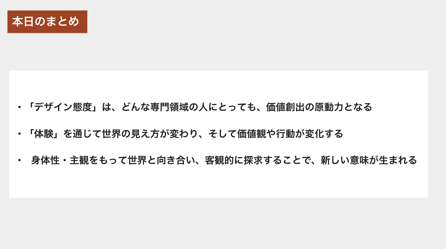 イベントの総括として、八重樫さんは、デザイン的態度とは、「与えられた問題」を疑い、「そもそも何が問われるべきか」という問いを再構築するスイッチ、すなわち「慣習モード」から「デザインモード」への切り替えであると述べました。