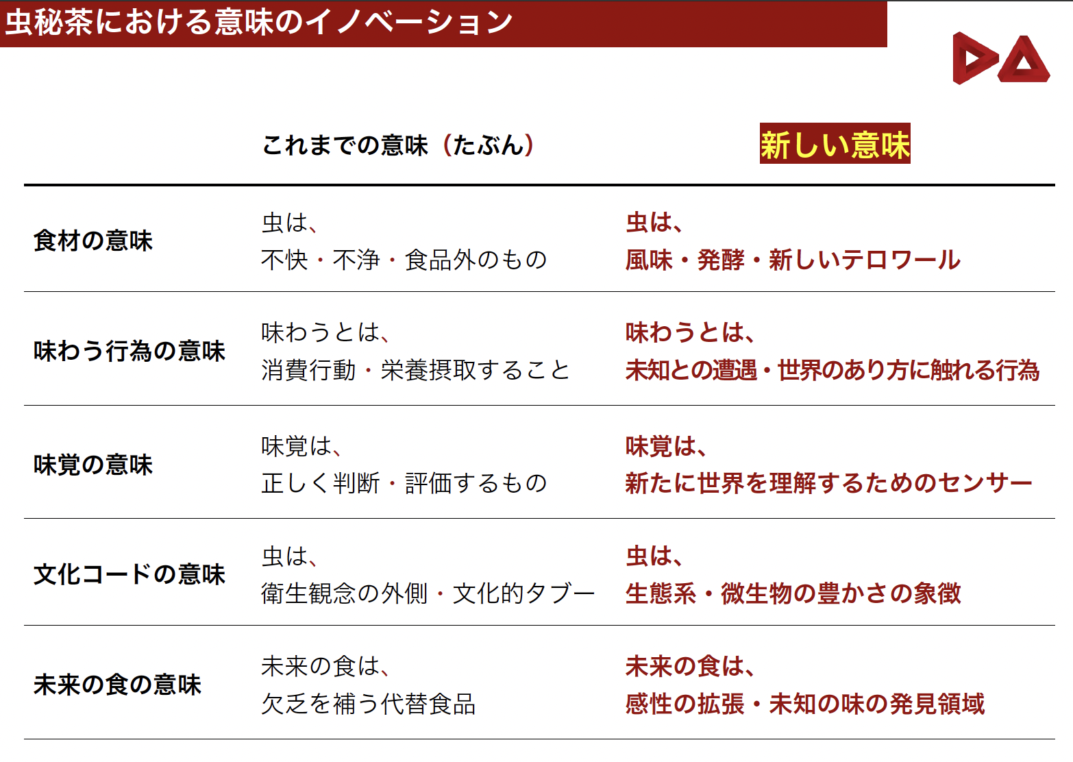 続く登壇者おふたりのクロストークのパートで、八重樫さんは、虫秘茶を「意味のイノベーション」の視点から読み解きました。