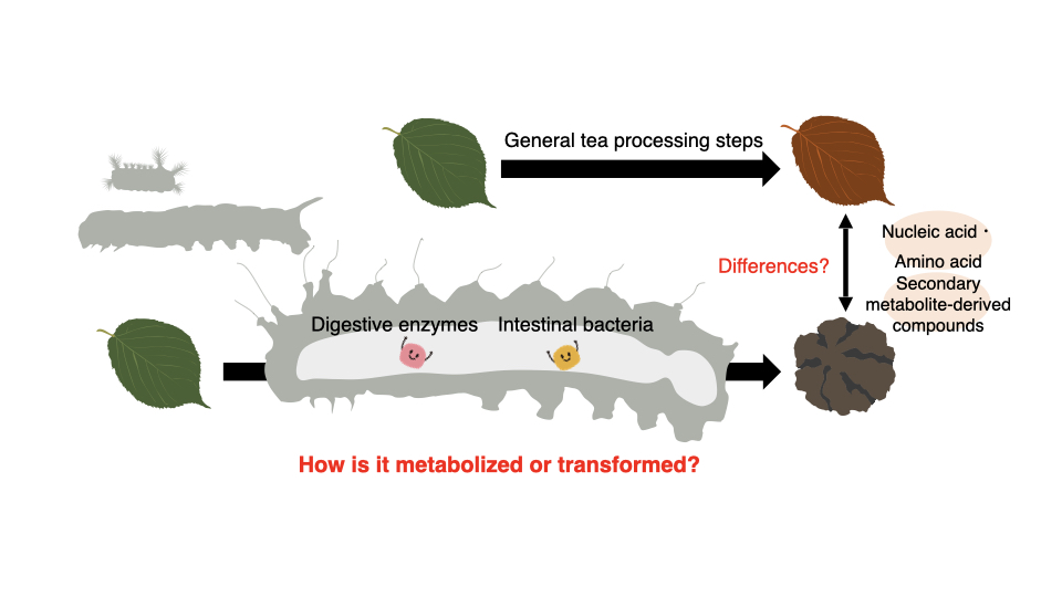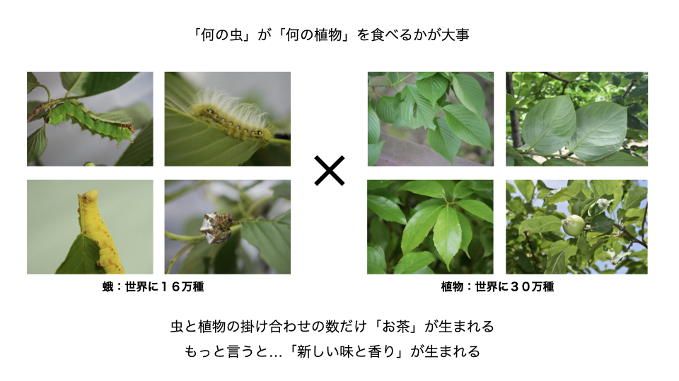 そこから、主観的な驚きを「ただの感想」で終わらせず、「なぜ?」を掘り下げ科学的に探求。茶葉をつくる際の発酵工程と、昆虫が葉を食べ消化するプロセスの類似性への気付きから、「天然の発酵装置」としての蛾の幼虫の可能性を見出します。