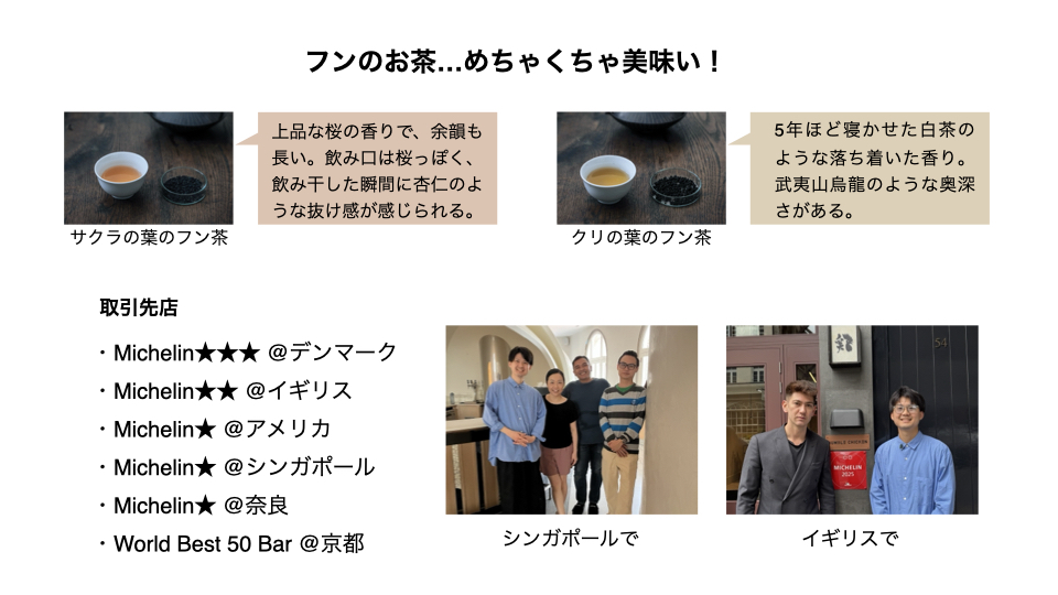 科学的なアプローチだけでなく、シェフやデザイナーといった他者との対話を通じて、それが単に香り・味わいのよいお茶であることを超えた、「新しいテロワール(土地の味)」の可能性であり、食文化として体験できる「生態系の結晶」であるという新しい意味を創出しました。