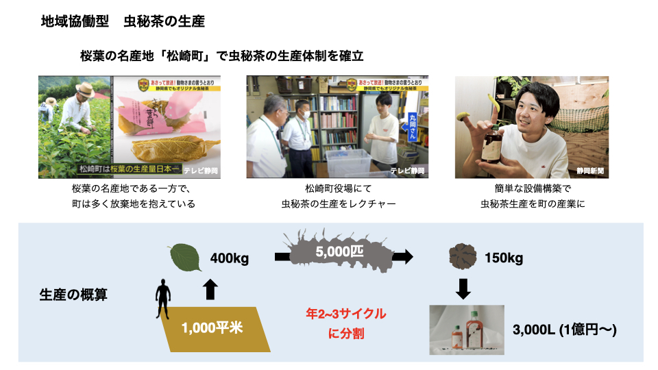 虫秘茶は、化学生態学の研究を通じて開発され、気鋭のレストランのシェフなど味や食体験に関わる専門家たちからも注目される、蛾の幼虫の糞から生まれるお茶。虫と植物、食文化を新たな体験でつなぐ、この研究と事業は、以下のようなプロセスで生まれたといいます。