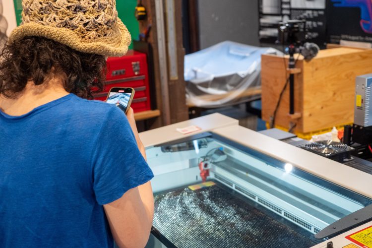 レーザーカッターの基本操作を確認した後は、いよいよ加工の工程へ。一人ずつ機械を操作して加工を始めると、メモを取る姿や加工スペースを覗き込みながらスマートフォンで撮影する姿も見られ、制作の一部始終が体験として心に残っていることが伝わってきました。その近くでは、アクリルを手に取ったり、制作風景を眺めるカフェご利用の方々の姿もありました。オープンな空間で展開されるワークショップだからこそ、訪れた人々に創作の熱気が広く伝わったのかもしれません。