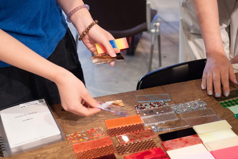赤や青、透明にきらめくものや奥行きを感じさせる模様入りのものなど、多種多様なアクリルが並ぶテーブルを前に、参加者さんは真剣な眼差しで手に取り、自然と会話が生まれていきました。「この色の組み合わせも良さそう」「こんな使い方もできるかも」と交わされるやりとりは、ワークショップのアイスブレイクを超えて新しいコミュニケーションの場になっていたように思います。「今度使いたい!」と、ワークショップが終わった後に使う予定のアクリルをたくさん抱えて購入する方も……!端から端までどれも欲しくなってしまいますね。