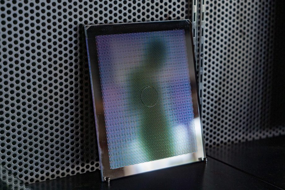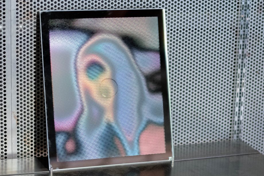 上田:「想像力で画像を迎えに行く」ように、ぼやけていてよく見えないからこそ積極的に対象を見ようとするんじゃないのか、という考えをきっかけに、このシリーズを始めるようになりました。人々は画像を見たいように見ると思いますが、それはまるで心理テストみたいだなと思っていて、今何を考えているのか、どういったものが好きなのか、その時の心情や今まで見てきた記憶といったものまで反映されているようだと思ったことから、(想像で補完された)画像は見る人を映し出す鏡みたいな存在だなということで、ミラーに画像をシルク印刷しました。