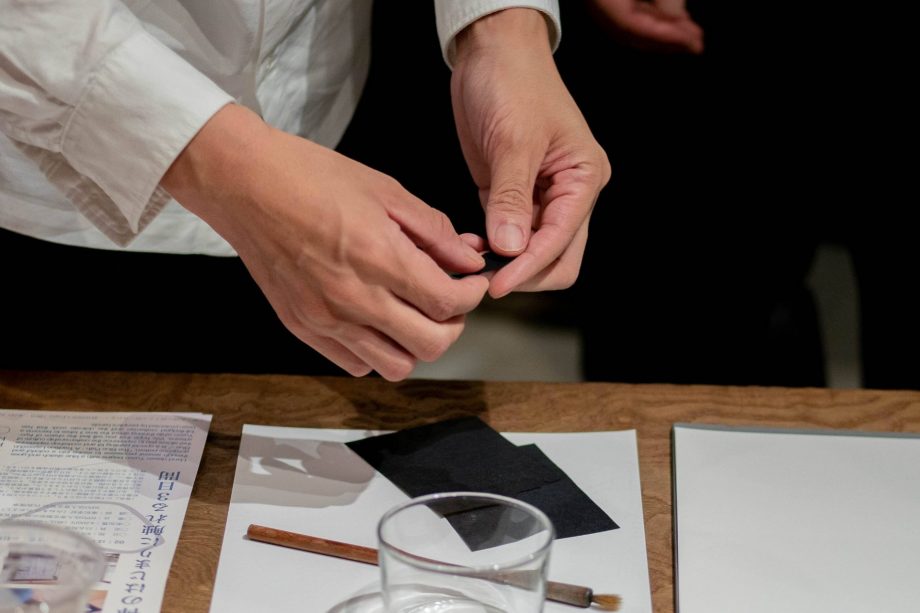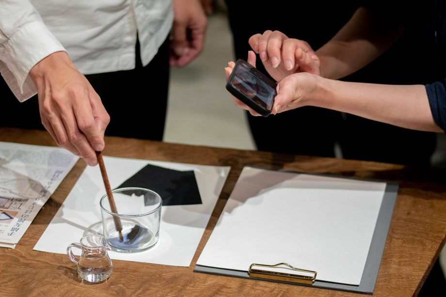 森内:青花紙は、手描友禅に用いられる伝統的な道具の一つです。和紙に「あおばな」という名前のお花を絞った液体を塗ってから乾燥させ、もう一度塗っては乾燥させるといった工程を繰り返し、和紙が黒っぽくなるまで塗り重ねることで青花紙は完成します。使い方について、青花紙を1枚千切って水に浸すことで、和紙に染み込んでいる青花が溶け出して、いわゆる「青いインク」が出てきます。その後はガラスペンや筆などに浸けて、インクとして自由にお使いいただけます。