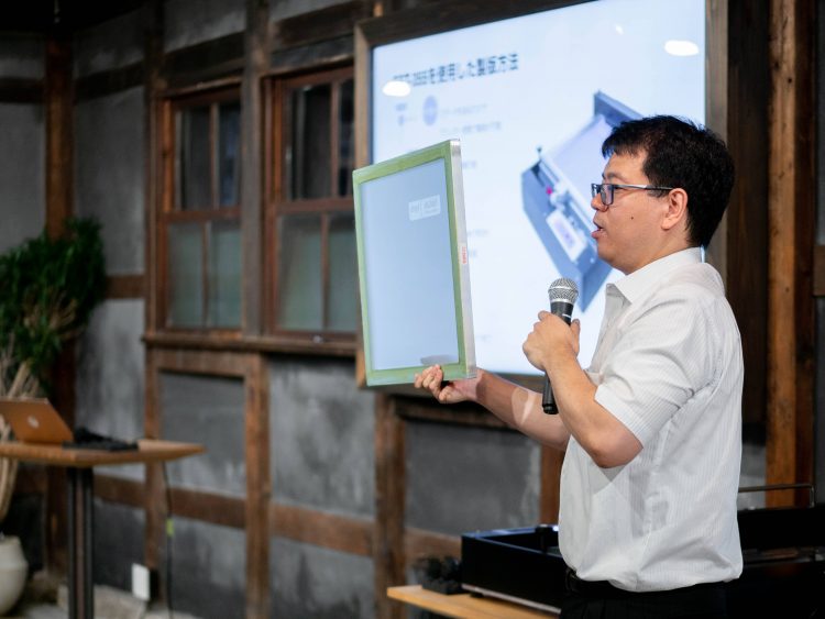 デジタル製版機のサービス開始を記念し開催されたトークイベント、 Fab Meetup Kyoto Vol.70 「粒子と定着のそのあいだ」。約30秒ほどで製版が完了する現代の高速デジタル製版機をはじめに、光を粒子としてとらえる表現と技術について、そしてテーマは時代を遡り、京都の壬生にて栄える型友禅の技術から、かつて手描友禅に欠かせない道具として重宝された染色素材まで。参加者が耳を傾けるなか、デジタルとアナログ、機械による大量生産と手工業という風に、これから先の新たなものづくりを築く要素を見出すことができるような、大変有意義な時間となりました。
