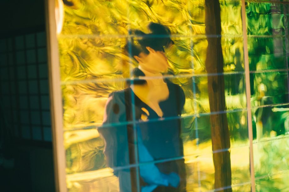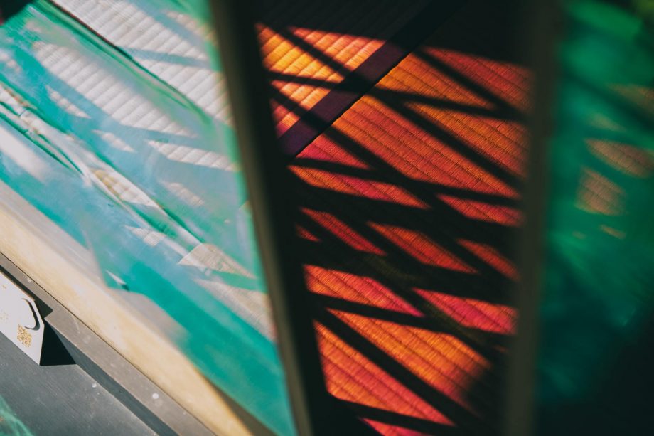 自然と人との間の関係性を偏光フィルムにより再構築し、自然の美しさに対して新たな視点を得ようとした作品。南向きの茶室の建具として設置することで、1日を通して光の影の色が変わっていく。太陽の動きを色で捉えながら、庭を鑑賞する作品として展示された。